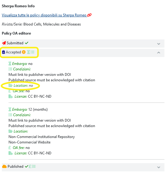 A destra di ogni policy recuperata sono visibili delle icone (per cui è stata aggiunta una leggenda descrittiva) che indicano la presenza di alcuni vincoli da rispettare per poter depositare l'allegato ad accesso aperto: