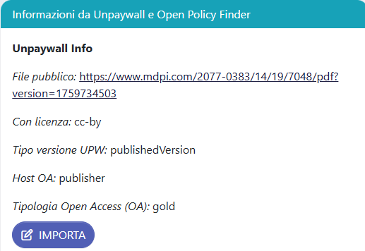 Nella sezione compare anche il pulsante Importa. Se cliccato, il sistema esegue il recupero automatico del file disseminabile ad accesso aperto e delle relative informazioni, precompilando alcuni capi della scheda: