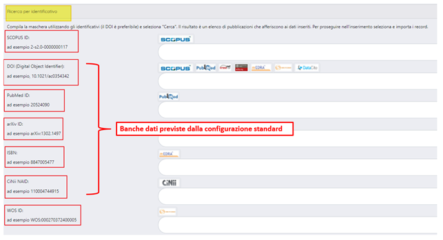 - Ricerca per identificativo (Scopus, WOS, DOI, PUBMED o ISBN ecc.): inserisci il codice nella casella corrispondente alla banca dati di riferimento (puoi inserire più codici separati da punto e virgola). Se il sistema trova il prodotto corrispondente al codice inserito, lo propone per l’importazione.