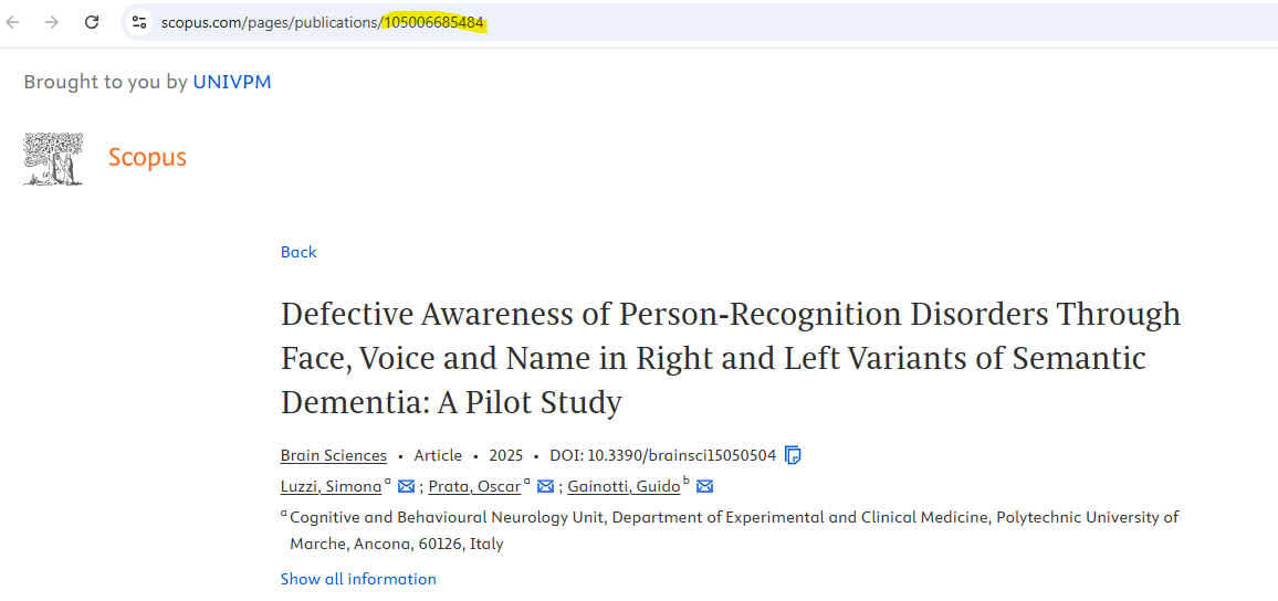 Per trovare il codice Scopus occorre aprire la banca dati e ricercare la propria pubblicazione, quindi guardare la URL della stessa. Il codice è il numero che compare in fondo.