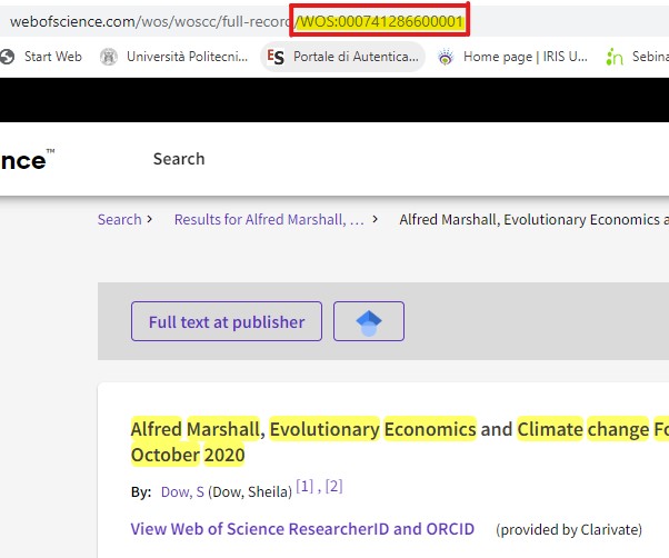 Per trovare il codice Scopus occorre aprire la banca dati e ricercare la propria pubblicazione, quindi guardare la URL della stessa. Il codice è il numero che compare alla fine della stringa. N.B. deve essere riportato in IRIS anche il prefisso “WOS:”