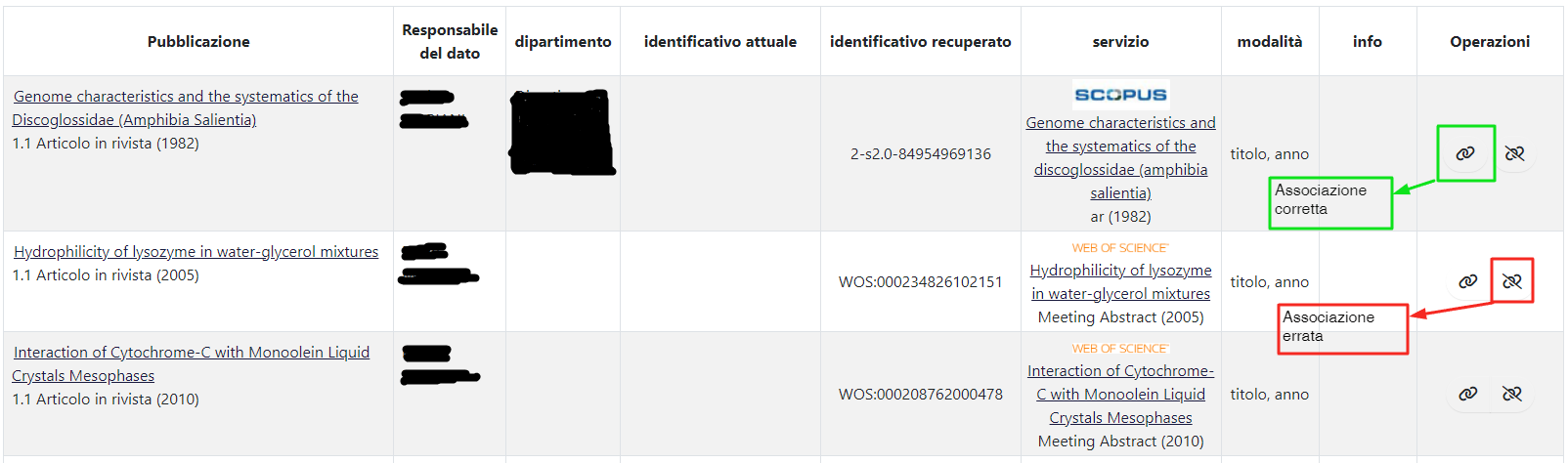 La correttezza del legame proposto va verificata confrontando la scheda di IRIS, che si apre cliccando sul titolo nella colonna Pubblicazione e la scheda di WoS e/o Scopus, che si apre cliccando sulla relativa icona nella colonna Servizio.